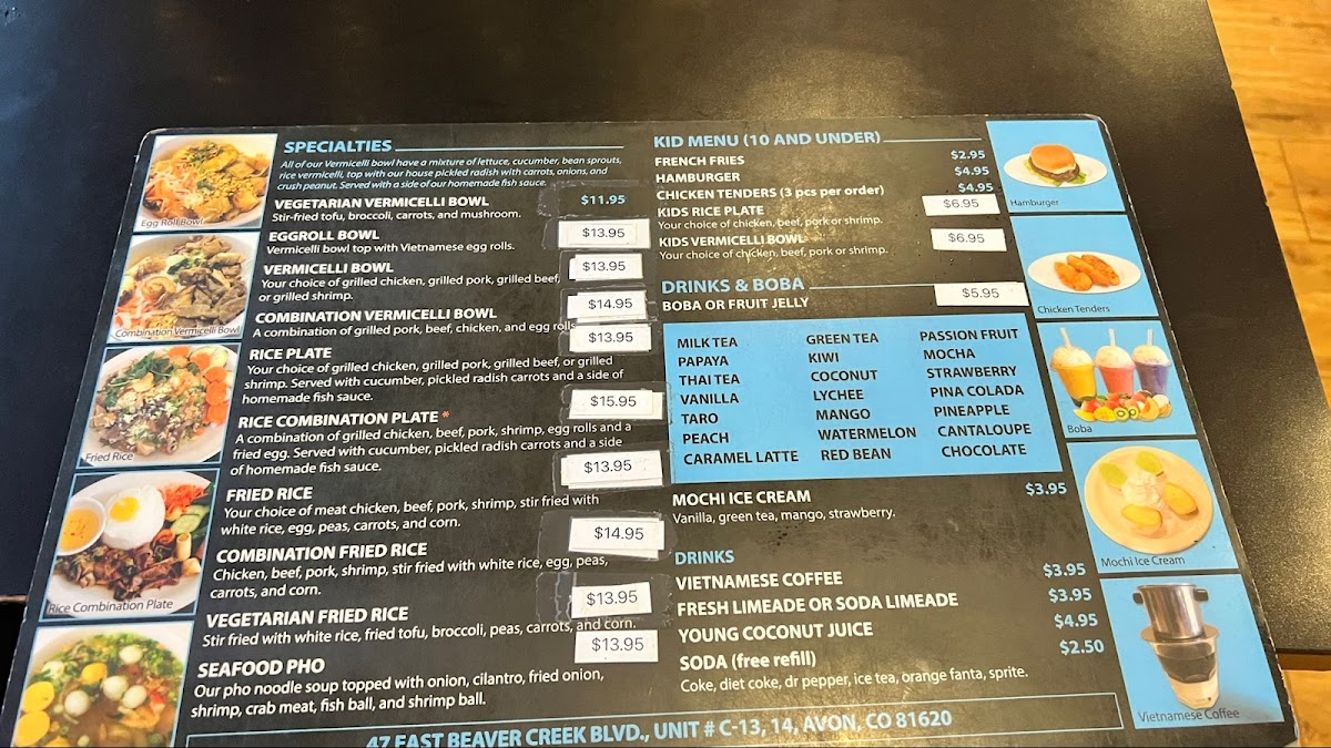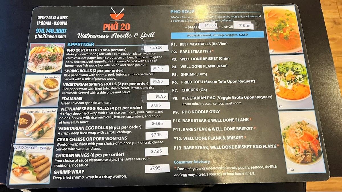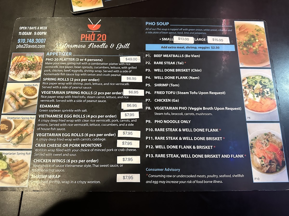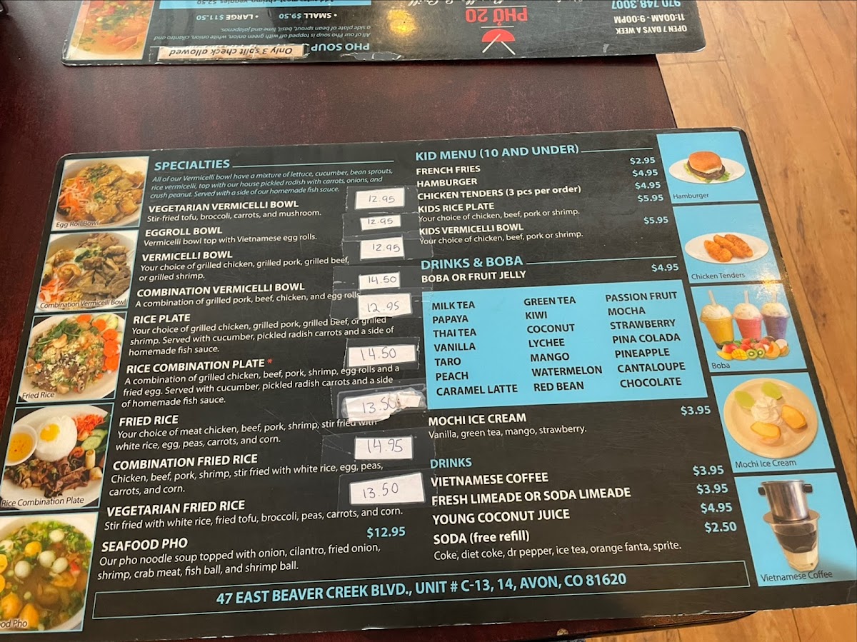 When you walk into Phở 20, you're in for a treat! This cozy spot in Avon, CO, is all about bringing you authentic, flavorful Vietnamese pho and other comforting dishes. Whether you're a pho enthusiast or new to the world of Vietnamese cuisine, the Phở 20 Menu has something to satisfy your cravings. From the classic beef pho with tender cuts of meat to the rich, aromatic broths that simmer for hours, each dish promises a burst of flavor. The menu also offers a variety of rice dishes, fresh rolls, and even vegetarian options, making it a great choice for everyone. If you're looking for a warm bowl of pho to comfort you on a chilly day, Phở 20 is the place to be.